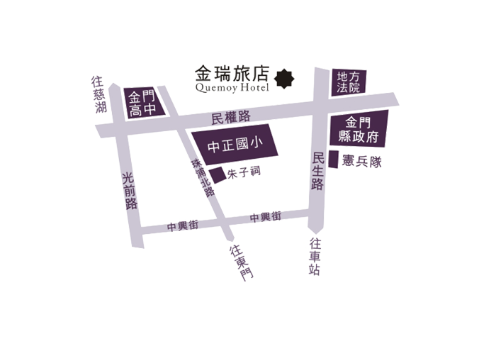 尚義機場出口道路;中山路左轉環島南路三段,接桃園路後直行,再接伯玉路至金城市區;遇圓環右轉民生路直行,途經金城車站等景點,過金門縣政府後左轉民權路即可。
